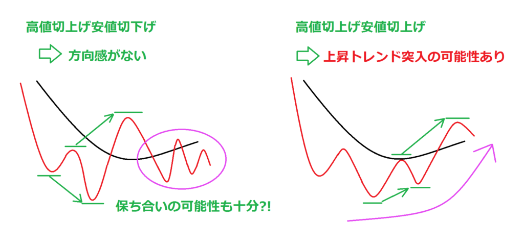 上図・左のように高安値の方向感が失われてしまえば、もみ合いの結果、再度下げトレンド継続の可能性も出てくるので注意が必要です。