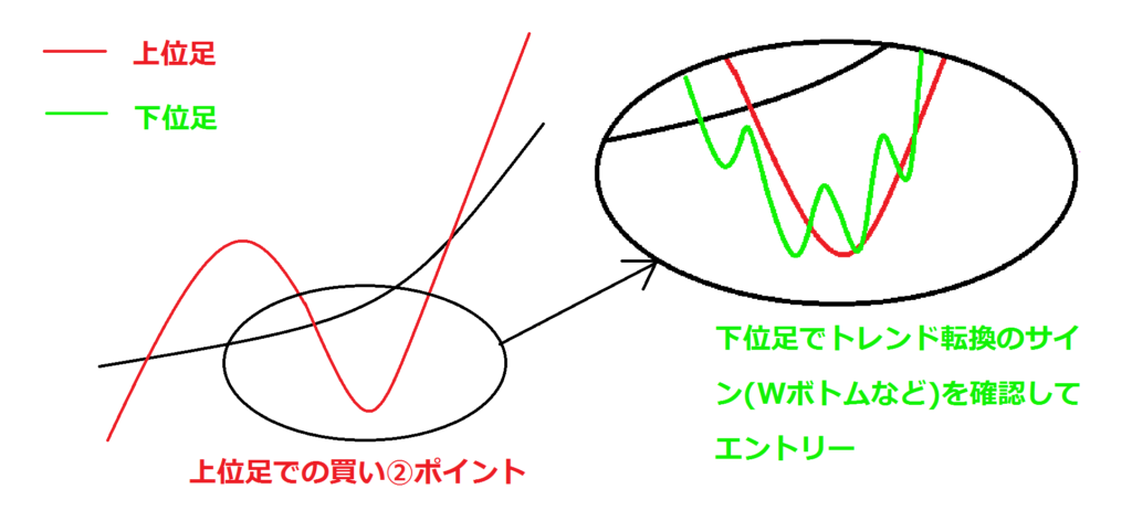 上向きの移動平均線を下抜けた後の反転ポイントを狙う、つまり、押し目を狙ったエントリーポイントです。