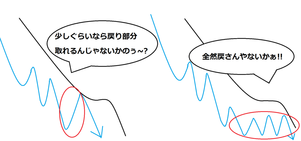この時は移動平均線がだいぶ下向きになっている場面です。売り①を経ることで、既に大衆心理は下降トレンドに気持ちが傾いた状態です。できる限り早い段階で戻り目を掴みたくてウズウズしているはずです。
