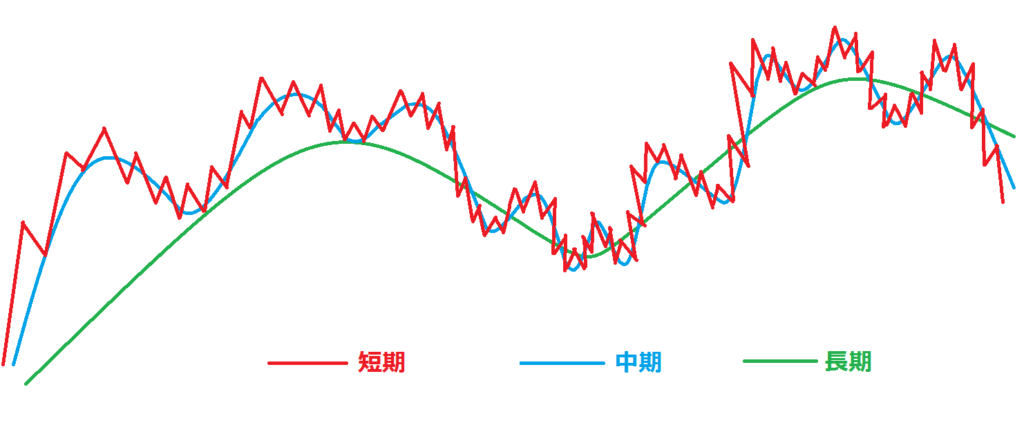 大きな長期の波の中に中期の少し小さな波がありますね。更にその中期の波の中にもっと小さな短期の波があります。
