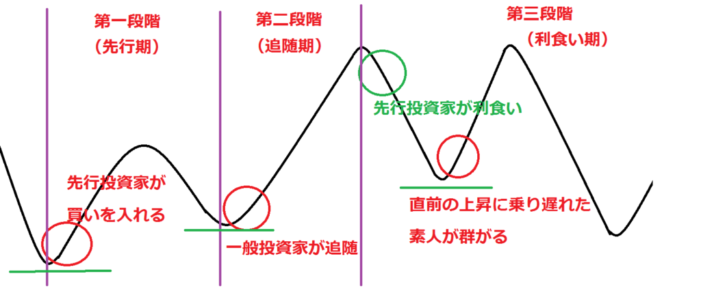 市場価格が底打ちし、悪材料も出切った状態で大口投資家が早期に買いを入れていく段階です。底値圏で上下し、トレンドの動きが読めない段階にあるので、私たち一般投資家が参入していくのは非常に難しく、至難の業と言えます。